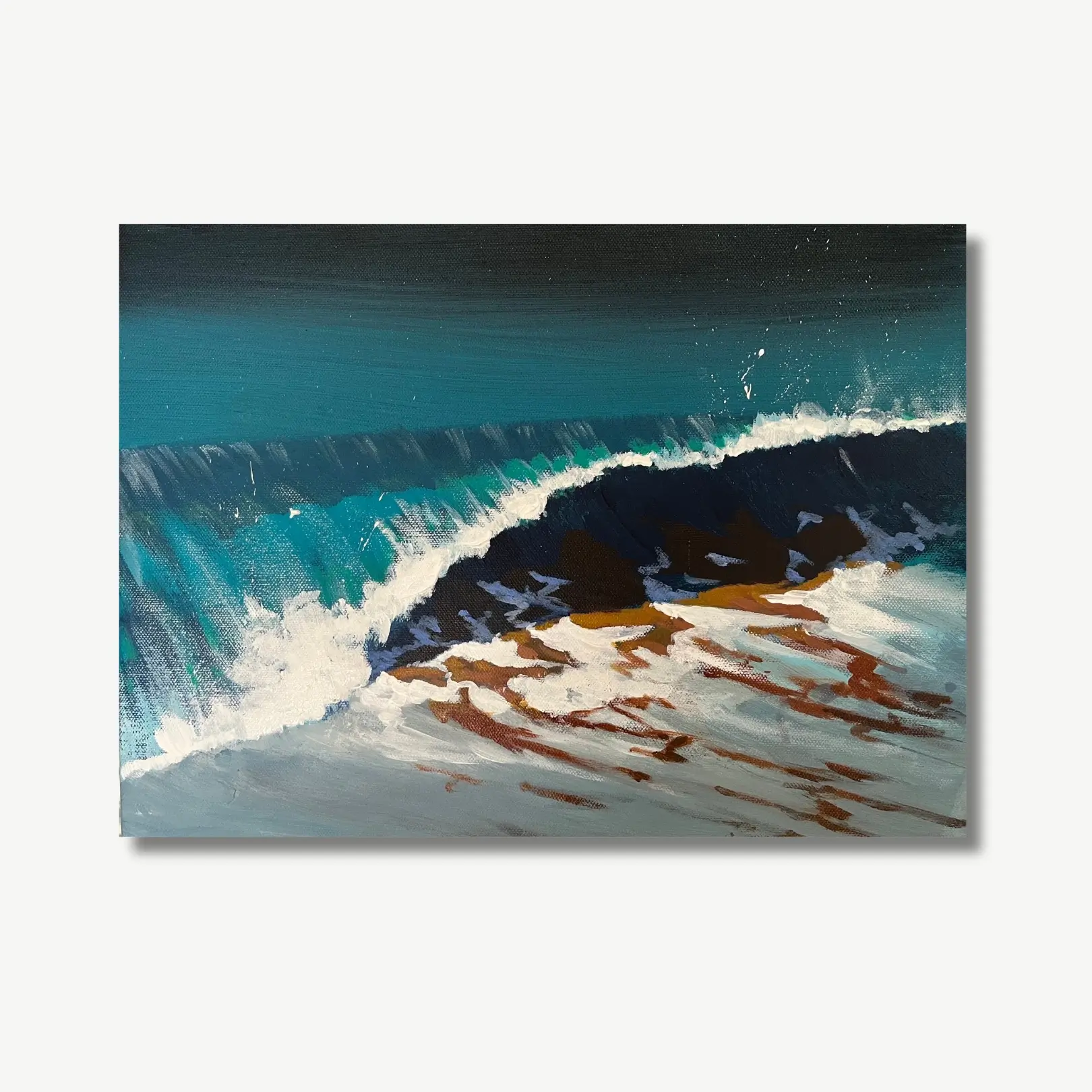A small ripple, delicate and persistent, brushes the California shore in a silent act of return. In the painting, the thin water lifts golden grains of sand, leaving a shining trail that reflects the warm sky. There is calm and intimacy: the sea doesn’t roar, but whispers, telling the poetry of the everyday.