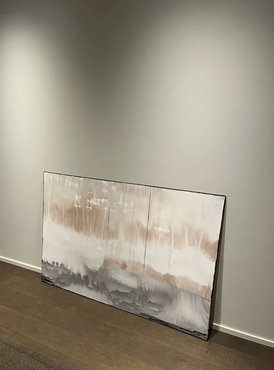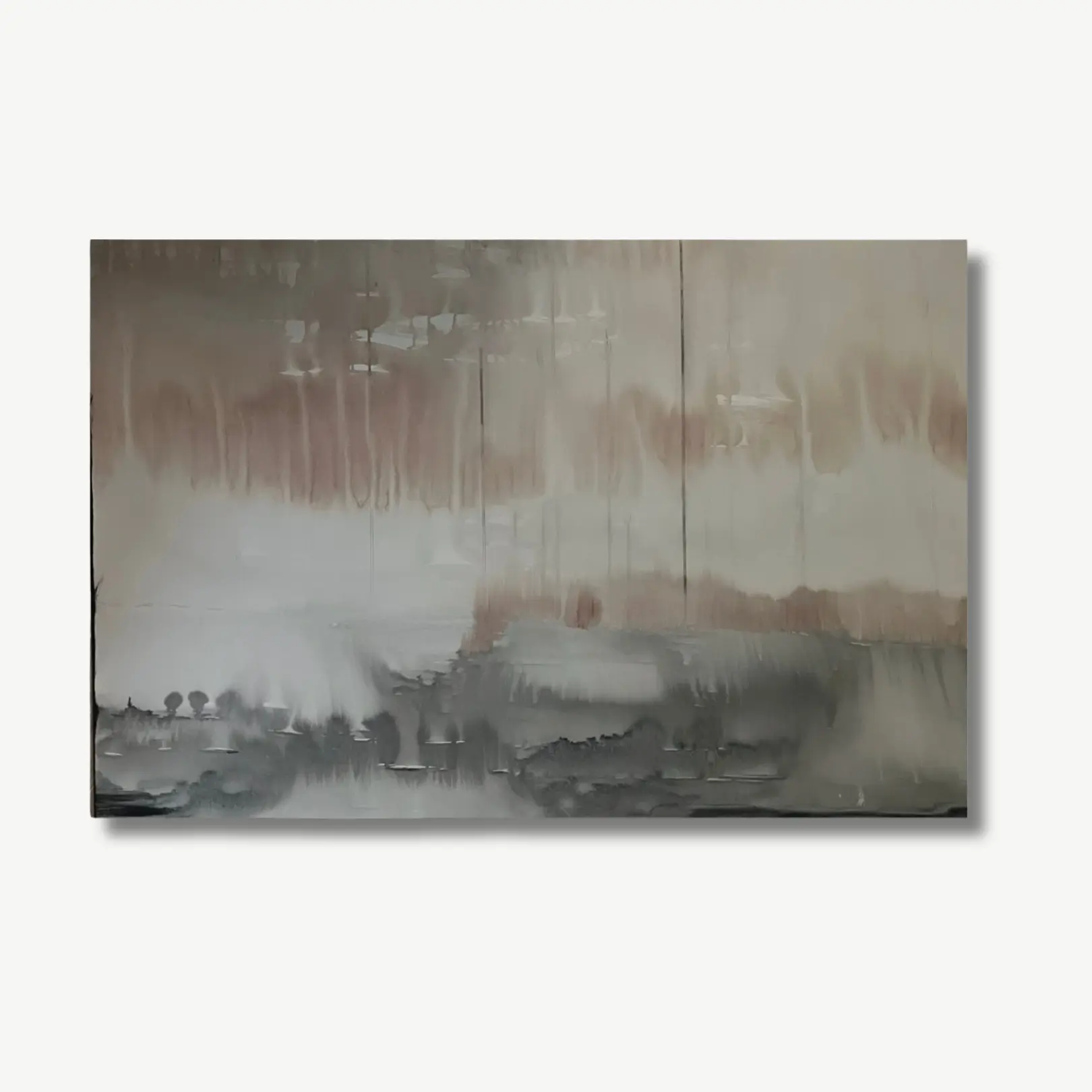 An evocative landscape takes shape through shades of beige, purple, and gray, suggesting a rarefied and dreamlike forest. The abstract forms hint at trunks and mists, more felt than seen. It adds depth and mystery with sophisticated discretion.