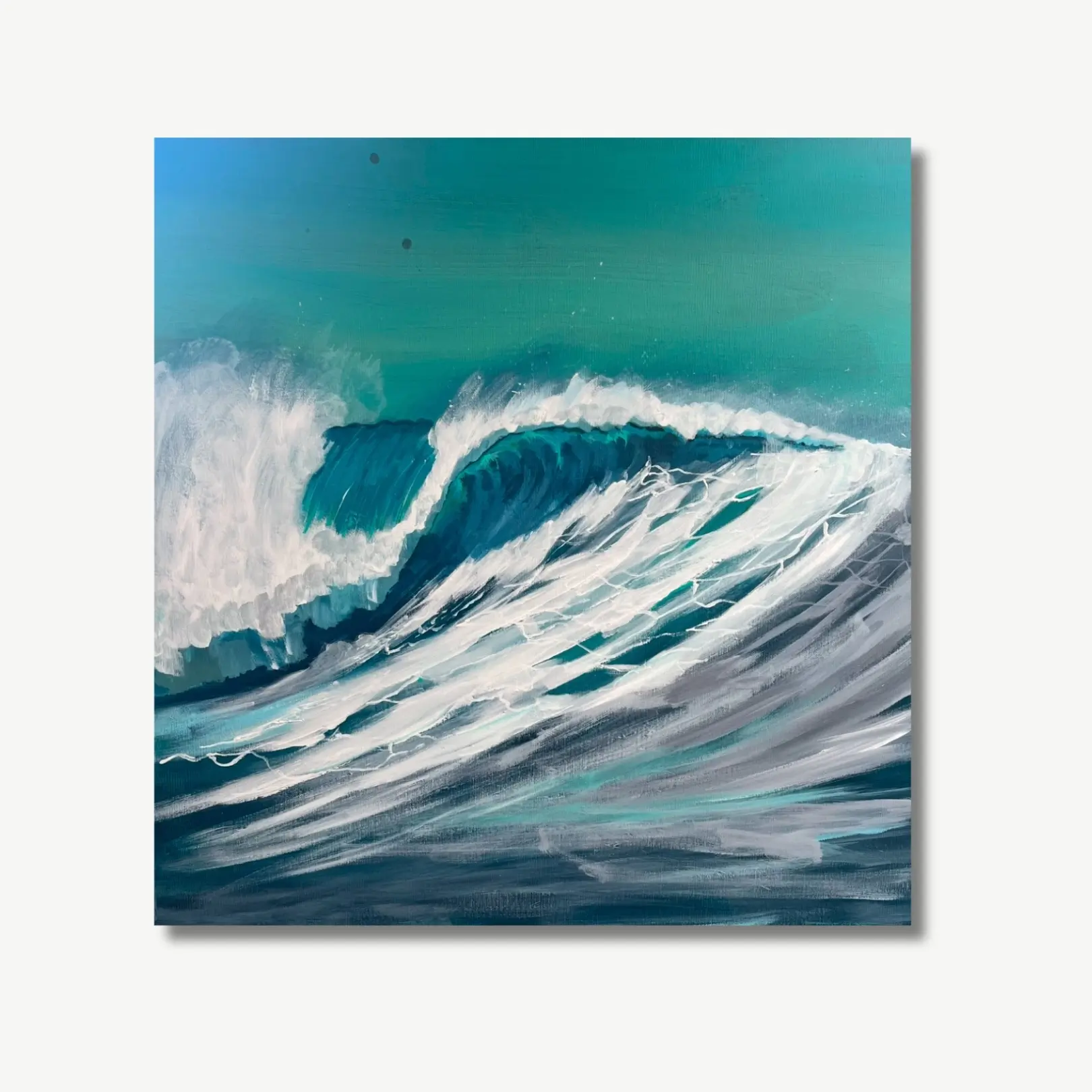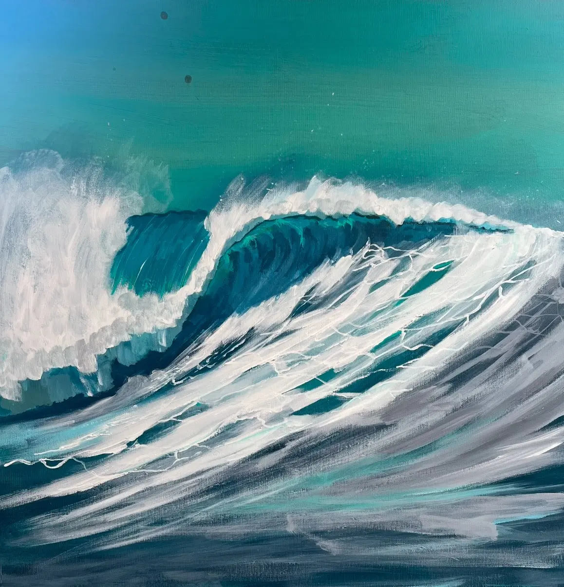 “The Blue Room” is a fantastical immersion into the heart of the Sardinian sea, where the walls seem made of water and dreams. The painting evokes a marine refuge filled with turquoise light, ancient maps, unfurled sails, and shadows of pirate ships sliding through crystalline waves. It is a room suspended in time, where every corner tells an adventure: sunken treasures, flags in the wind, and the eternal mystery of the deep blue.