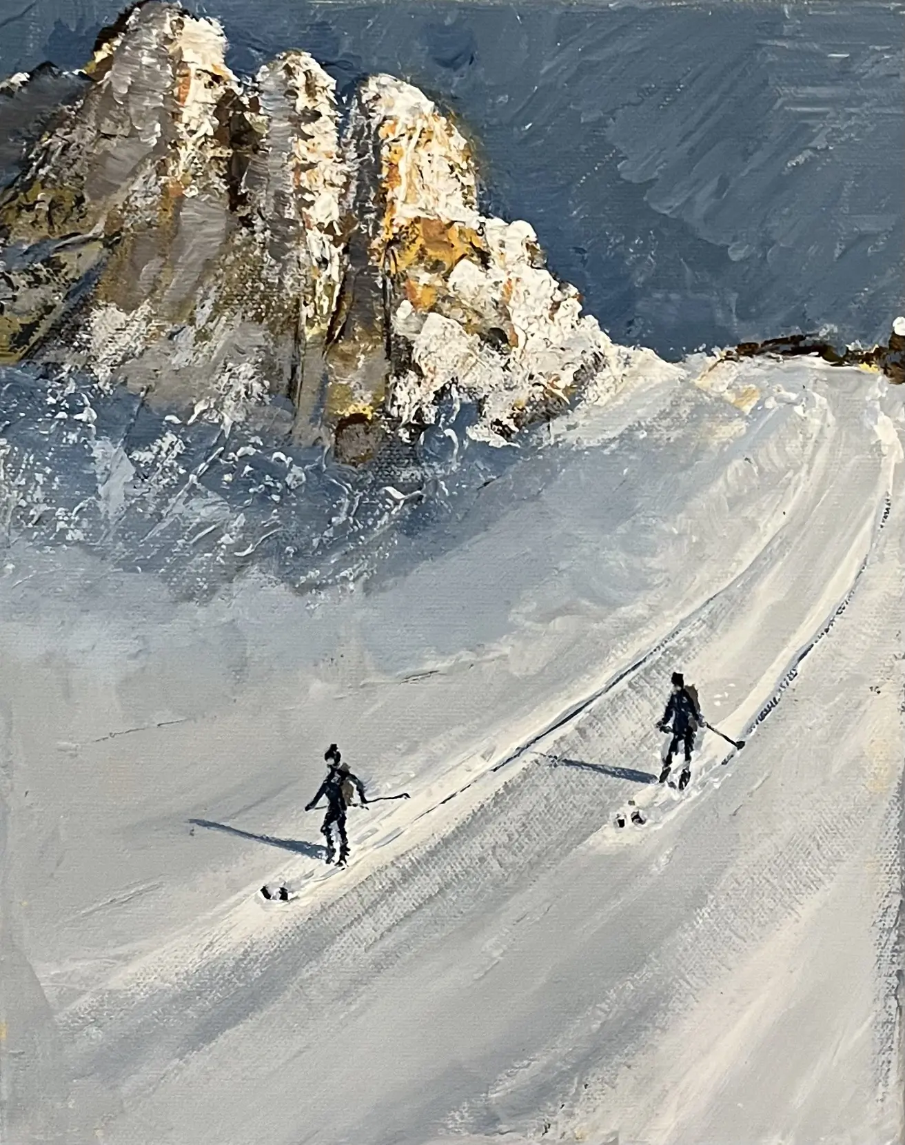 The painting captures the raw emotion of the 1950s, when discovering a new freeride path was a pioneering act, driven by instinct and courage. Amid untouched snow and deep silences, there was a breath of absolute freedom and a sense of wild conquest. A visual ode to adrenaline and the purity of the origins.