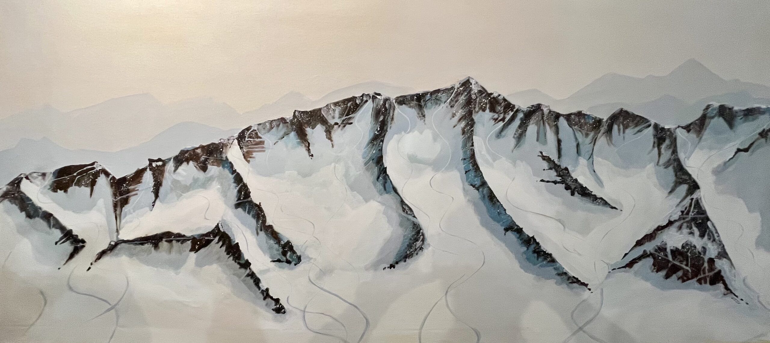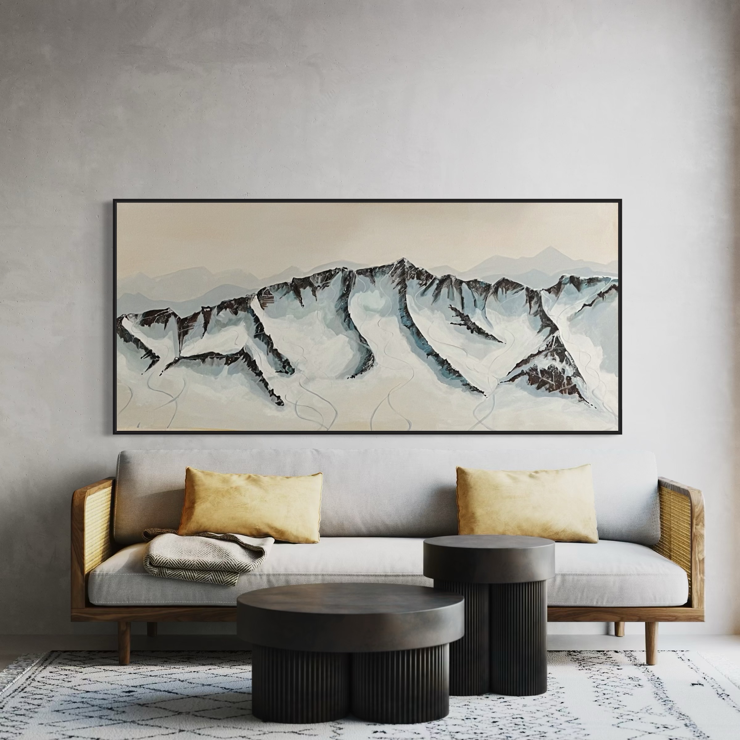 Una maestosa montagna innevata domina la scena, avvolta da cieli silenziosi e luce fredda. Le pennellate ampie e materiche trasmettono quiete e grandezza, portando l’immensità della natura dentro uno spazio raccolto. Perfetto per amplificare visivamente una piccola casa con eleganza e respiro